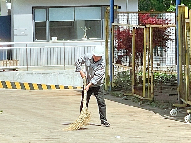午休時(shí)分的陽光斜斜地灑在附屬樓前的道路上,一個(gè)熟悉的身影正在專注地清掃著落葉。那是供應(yīng)部的庫管員盧海峰,他弓著背,手中的掃把有節(jié)奏地劃過地面,揚(yáng)起細(xì)小的塵埃。這本不是他的分內(nèi)工作,卻成了他工余的習(xí)慣。